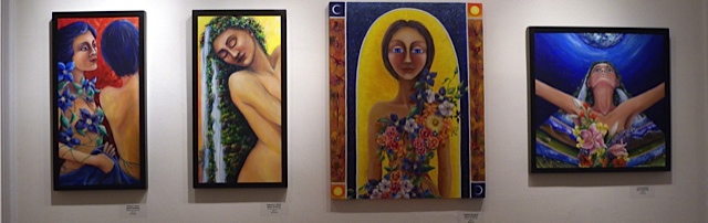 With brilliant colors, whimsical faces and scenes of nature fused with the female body, Santander brings to life the timeless legend of Pachamama, Mother Earth. Santander draws the viewer into a world filled with loving kindness and warmth. Old and new coexist. Indigenous and contemporary blend into one. Forms of Mother Earth evolve into voluptuous shapes with forests, waterfalls or mountain vistas or red flashes of anger at careless human pollution of land and water. Santander’s paintings remind the viewer that Mother Earth is as sensual as she is powerful.