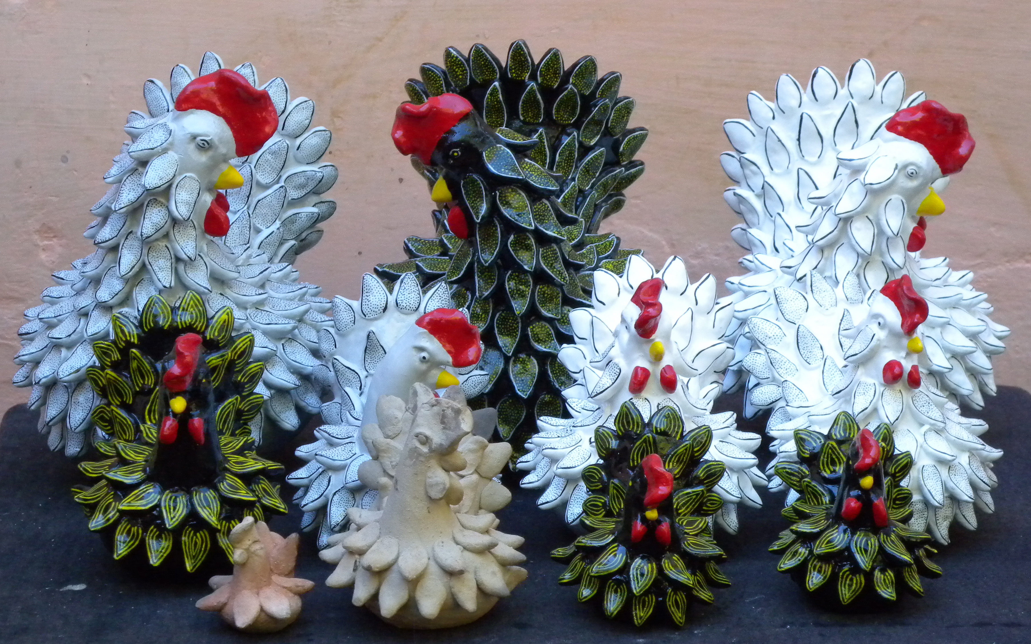 Sitting next to Fermina is her son-in-law, Pablo Galliano, handsome, dark with a gentle expression. Pablo Galliano slips his glasses on. In his lap rests a white painted clay chicken ready for the finishing touches of black ink. With elegant long fingers, Pablo lifts a fine black ink Sharpie pen and begins to add several lines to each feather on the chicken. Slowly, with a steady hand of a surgeon, the white chicken with black highlights emerges.