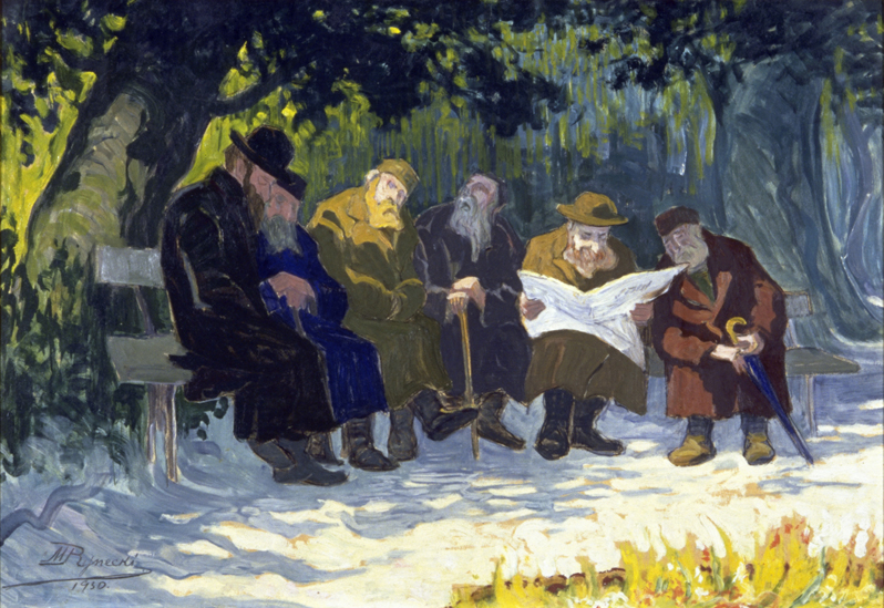 Moshe’s illustrations are poignant windows into a life of faith, prayers in the synagogue, reading the Torah, market scenes, children playing and the timeless image of old men on a park bench. Each person had a name, a family and loved ones.