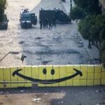 This Egyptian graffiti began to emerge in a modern culture, with its own style, voice and urgency. Invoking the Pharaonic ancient Egyptian Ramose after soccer (football) fans were killed. Alerting people to the use of tear gas. Reminding people of the deadly actions taken by the state. Then, the tragic humor – a smiley face juxtapose a gathering of tank officers or a machine gun instead of shooting bullets is shooting out white doves. One illustration in Arabic quotes a verse from the Quran says,
