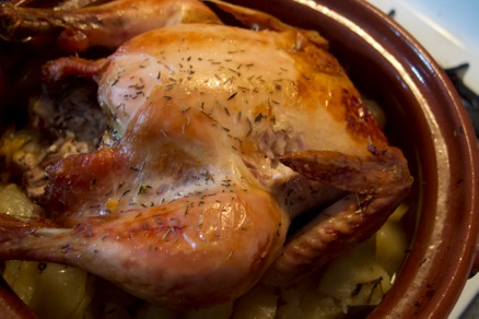 Grandma Euterpe’s (“yaya Efterpi’s”, γιαγιάς Ευτέρπης) roast chicken “psito kotopulo” (ψητό κοτόπουλο) with lemon, olive oil, oregano. More herbs optional! A classic Greek dish. The potatoes collect all the juices and flavours while they cook slowly under the chicken. Pieces of “kefalotiri” (κεφαλοτύρι) will make it richer.