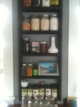 With minimum shelf space and what must approach zero waste, dried food is acquired in bulk and stored in small jars lining a wall or even in small Grundt magnetic containers from Ikea attached to the ceiling steel beams.