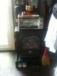 - Electric stove heater with convection oven and solar battery and panel behind.
