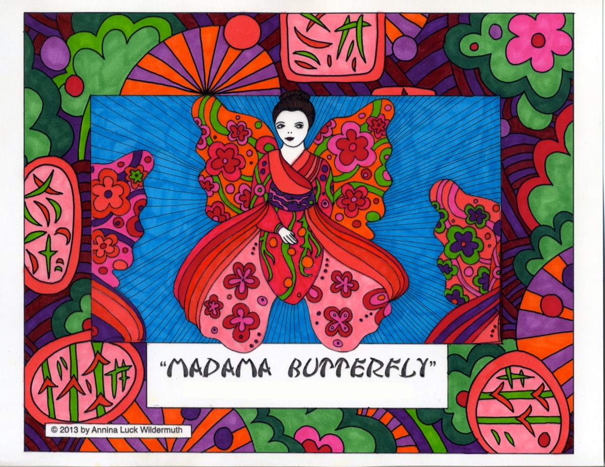 A creative coloring activity with Madame Butterfly by Annina Luck Wildermuth who always weaves in a bit of Greek mythology into her work. Enjoy one of her opera butterflies, print the pdf and color one yourself.